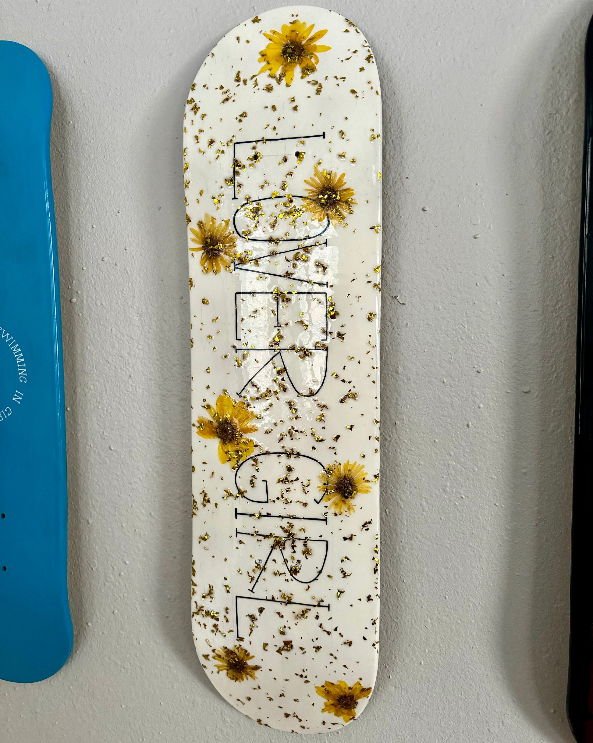This skate deck is hand-painted resin coated. Yes this skateboard deck is made as art, not to be ridden. The deck's main color is white with black letters, real dried yellow flowers, and gold glitter flakes all coated in clear and glossy resin. The backside of the deck is unpainted in a light oak color with no resin.